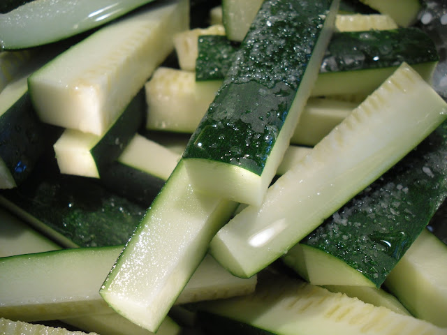 Place the zucchini sticks in a colander over a bowl and sprinkle with the tsp. of salt. Let drain for 1 hour or longer; rinse and pat dry.