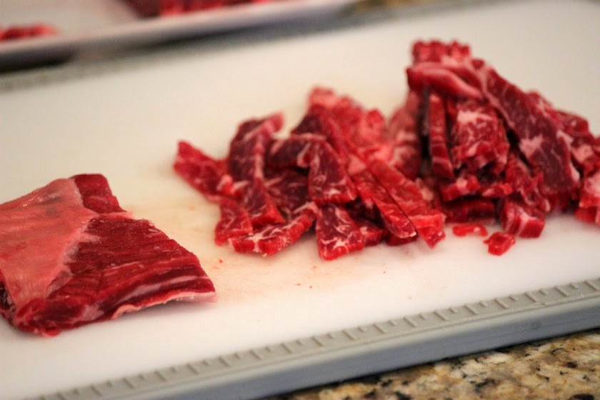 Slice skirt steak into 3″ pieces going along the grain of the meat. Place on tray and freeze for 30 minutes.
