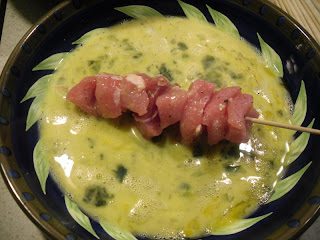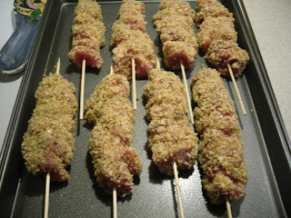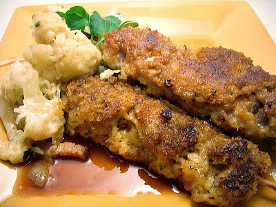 Not many people have heard of City “Chicken”. It is not chicken at all, but breaded pork and veal skewered. I was introduced to City Chicken years ago by a relative who lived “up the lake” in Pennsylvania. After some research, I discovered that an overwhelming majority of people who have heard of this dish live in regions of Pennsylvania. There have been some sightings in Milwaukee, Sheboygan and Detroit. I recall when we were there for an overnight stay, Mary chopping up lots of garlic, adding it to the veal and pork cubes and marinating this overnight. I marinated the meat with the garlic for an hour. Her husband made her “special” skewers or dowels especially for her City Chicken. Most wooden skewers come 10 inches long and I had to cut them down to 8 inches to accomadate my frying pan. The original recipe originated during the depression when chickens were expensive. Pork and veal were substituted and fashioned to look like a drumstick. It’s the kind of dish you would expect Aunt Bee from Mayberry to serve Andy and Opie – Shazam! Of the few recipes I’ve found, most of them used cracker meal for the breading. I’ve updated it by replacing cracker meal with seasoned panko crumbs.