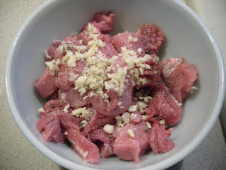Cut veal and pork into cubes. Add minced garlic, cover and marinate at least one hour or overnight.