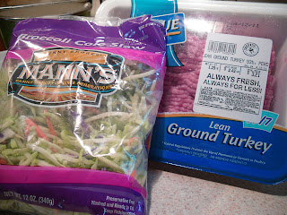 Down the Produce Aisle near the bagged lettuce, you will find Mann’s Broccoli Cole Slaw.  It consists of hearts of broccoli, carrots and a small amount of red cabbage.  This recipe was on the back of the bag.  I’ve been meaning to make something with ground turkey in it…and voila!  I thought the veg in the turkey meatballs would keep the meat moist.  This is an inexpensive, healthy meal.  Lean turkey and veggies all in one! The Broccoli Cole Slaw was $2.49 and the turkey was $3.21 – that’s only $5.70 and can feed a family of four.