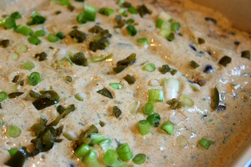 Cover the chips and cheese with the rest of the meat and bean mixture. Spoon on the sour cream mixture and spread it lightly so it covers the meat in an even layer. Sprinkle on the scallions and the jalapenos.