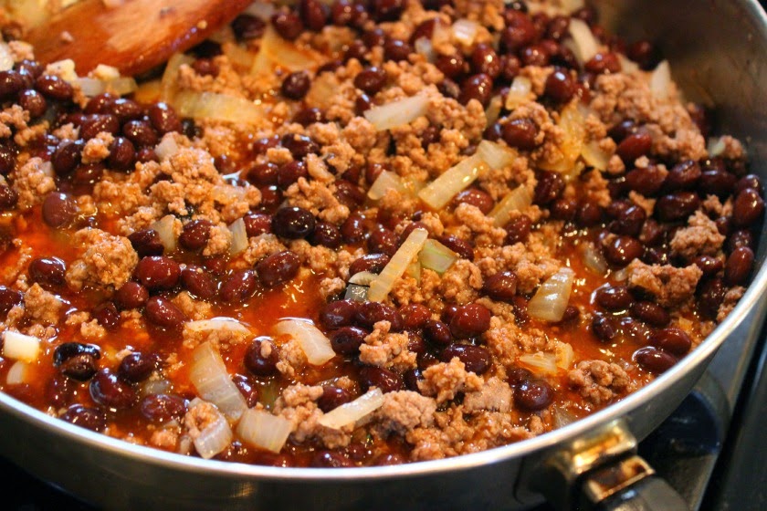 In a saute pan cook the beef, onion and garlic until the vegetables are soft and the beef is no longer pink, about 6-8 minutes. Drain fat. Lower the heat and add the enchilada sauce, salsa and black beans to the pan. Simmer for 10 minutes.