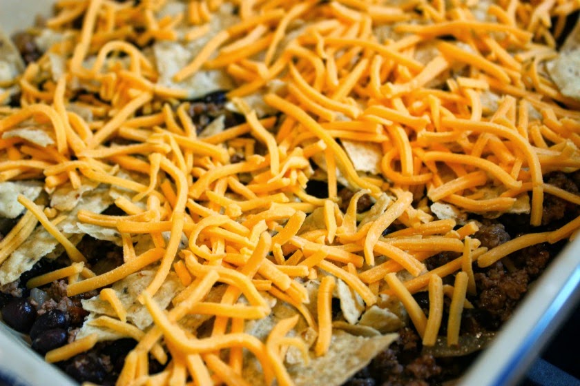 Spoon half of the meat and bean mixture into the bottom of a 9 x 13 pan. Top with half of the crushed chips and cheese.