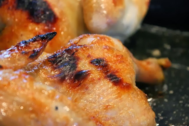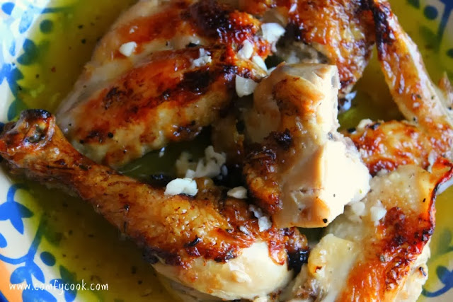 Remove chicken from broiler. When cool enough to handle, cut into serving pieces. Pour over lemon mixture. The chicken was not quite cooked through at this point.